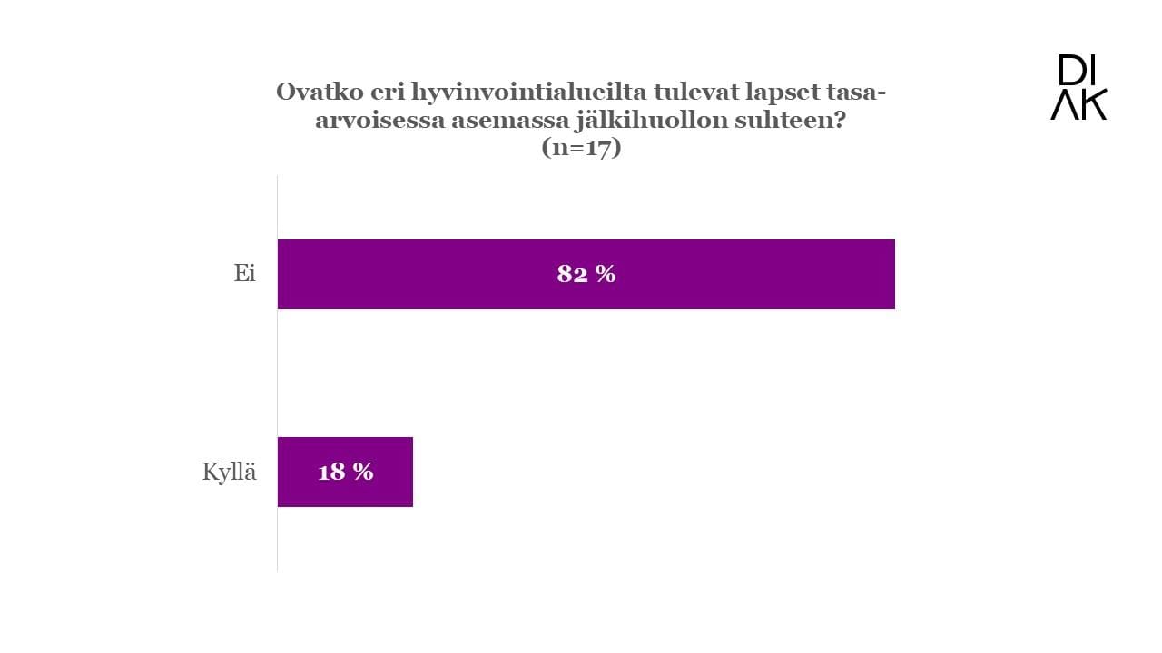 Kuvio 3. Ohjaajien vastaukset kysymykseen ”Ovatko eri hyvinvointialueilta tulevat lapset tasa-arvoisessa asemassa jälkihuollon suhteen?”